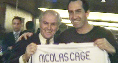 Un mail fechado en Los Ángeles, desde la misma compañía que solicitó recientemente la visita de Silvester Stallone fue el germen de toda la broma. El Madrid se lo tragó y recibió al falso Nicolas Cage (foto de Punto Radio) como a cualquier invitado ilustre: presenció el choque en el palco, Calderón le regaló una camiseta e, incluso, bajó al vestuario al final del partido.Vía Marca y El Periódico